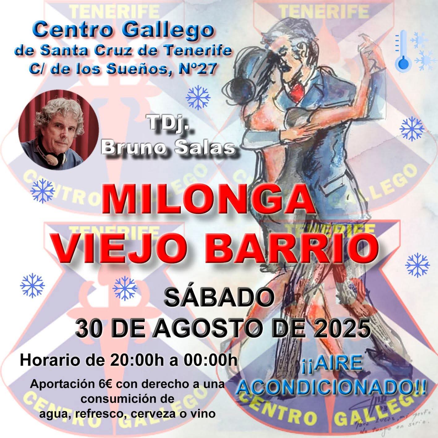 Este SÁBADO 30 DE AGOSTO contamos de nuevo con la MILONGA DECANA 🥳💃🕺🥳de Canarias «VIEJO BARRIO» en Santa Cruz de Tenerife, en el CENTRO GALLEGO, que desde su fundación, en diciembre de 1962, sigue apostando por la cultura y los actos sociales.